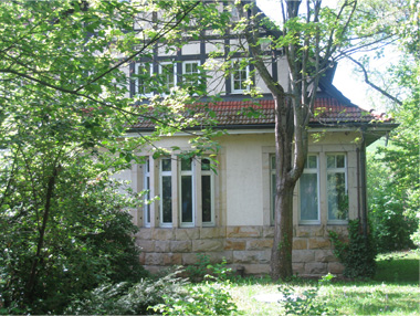Bezeichnend sind die horizontale Lagerung des Baukörpers unter dem weit vorkragenden Dach, das den wichtigsten gestalterischen Akzent setzt, sowie das rechtwinklig angeordnete Fachwerk im Giebelfeld und der hohe Rustikasockel mit ihren deutlichen Bezügen auf eine vorstädtische oder ländliche Umgebung. Dazu gehört auch der sich vorwölbende Erker, der durch Stege in schmale Fensteröffnungen unterteilt ist und als besonders charakteristisches englisches Architekturmotiv gelten kann.